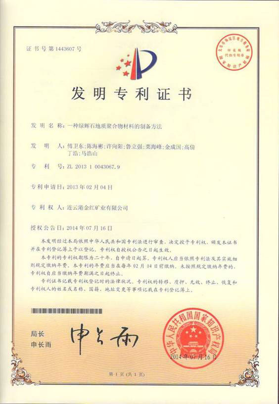 2014年7月,公司董事长、总经理等高管集体发明《一种绿辉石地质聚合物材料的制备方法》,荣获国家专利。